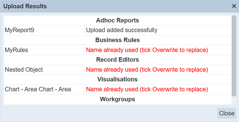 If the “Overwrite” field is selected prior uploading, any existing artifacts will be overwitten and new artifacts added.