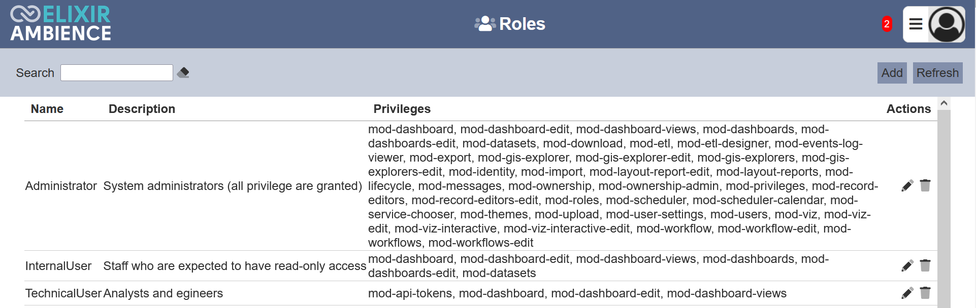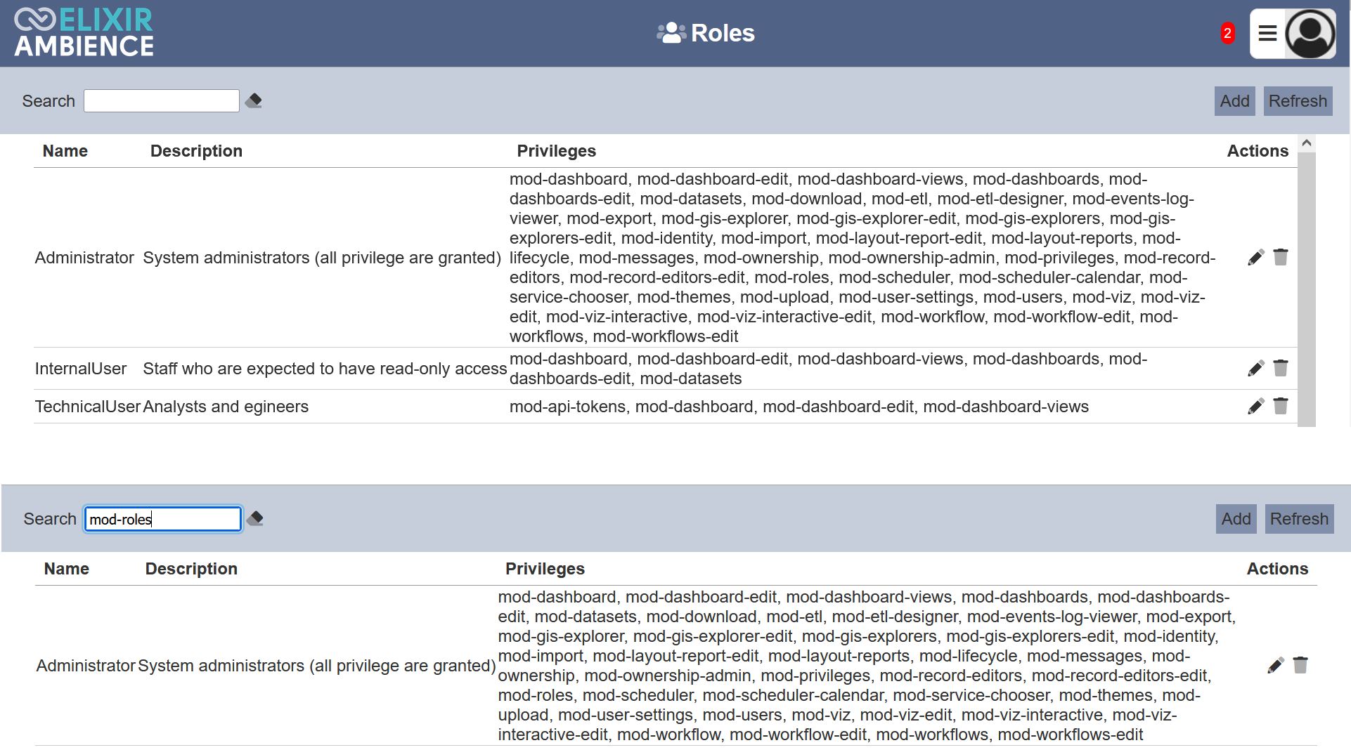 After performing actions (e.g. add role, delete role) on the browser window/tab, the list is reloaded to display the updated data. The manual “Refresh” button is available and is particularly useful if there are others making changes on the same page and/or the making changes to role assignments in the Users module.