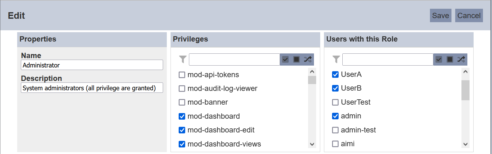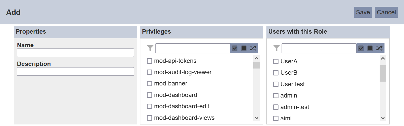 In the “Privileges” and “Users with this Role” section, select the desired privileges and users by selecting the checkboxes in their respective sections. Alternatively, you can search for the privilege and/or role by using the search function at the top of their respective sections. There are options to select all, select none and invert selection by clicking on their respective icons next to the search function.