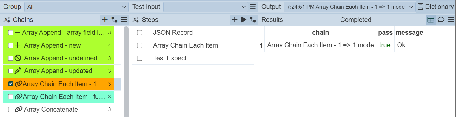 • Results - displays the output of a specific run record and list of run logs for the chainset