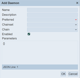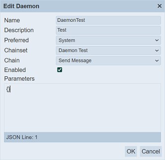 Select the desired ETL chainset and chain for the ETL daemon in the “Chainset” and “Chain” fields respectively. In the “Parameters” field, key in the desired parameters in JSON format for the ETL daemon.