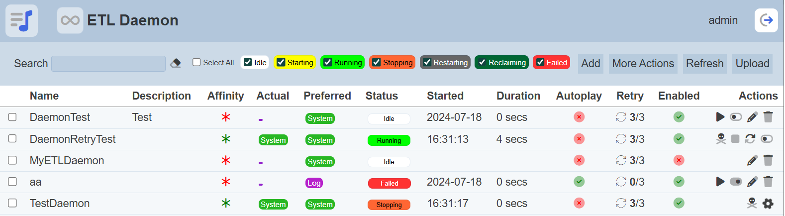 After performing actions on the browser/tab, the list is reloaded to display the ETL daemons. The manual “Refresh” button is available and is particularly useful if there are others making changes on the same page.