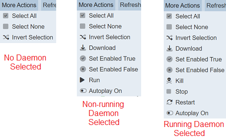 To perform an action on multiple daemons, select one or more checkboxes next to desired daemons. Click on the “More Actions” button at the upper right corner of the page.