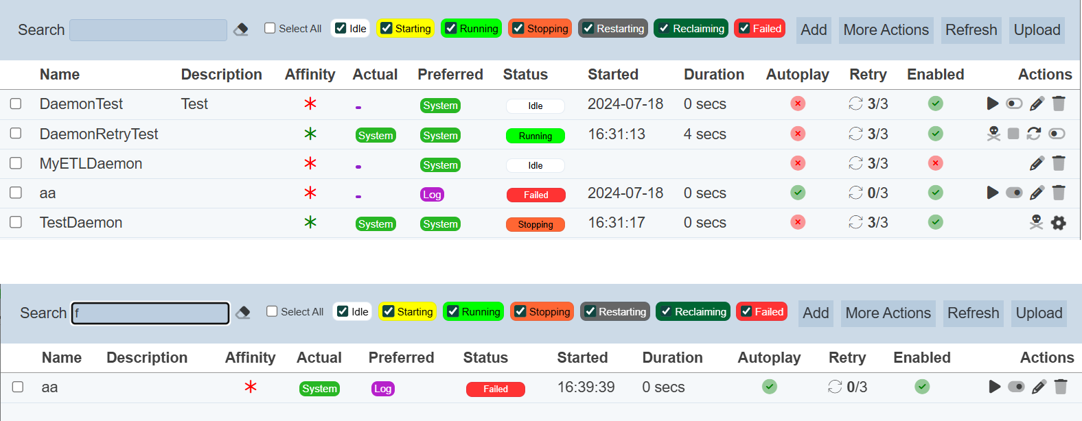 In the example above, ETL daemons that are assigned the role “tester” are shown.
