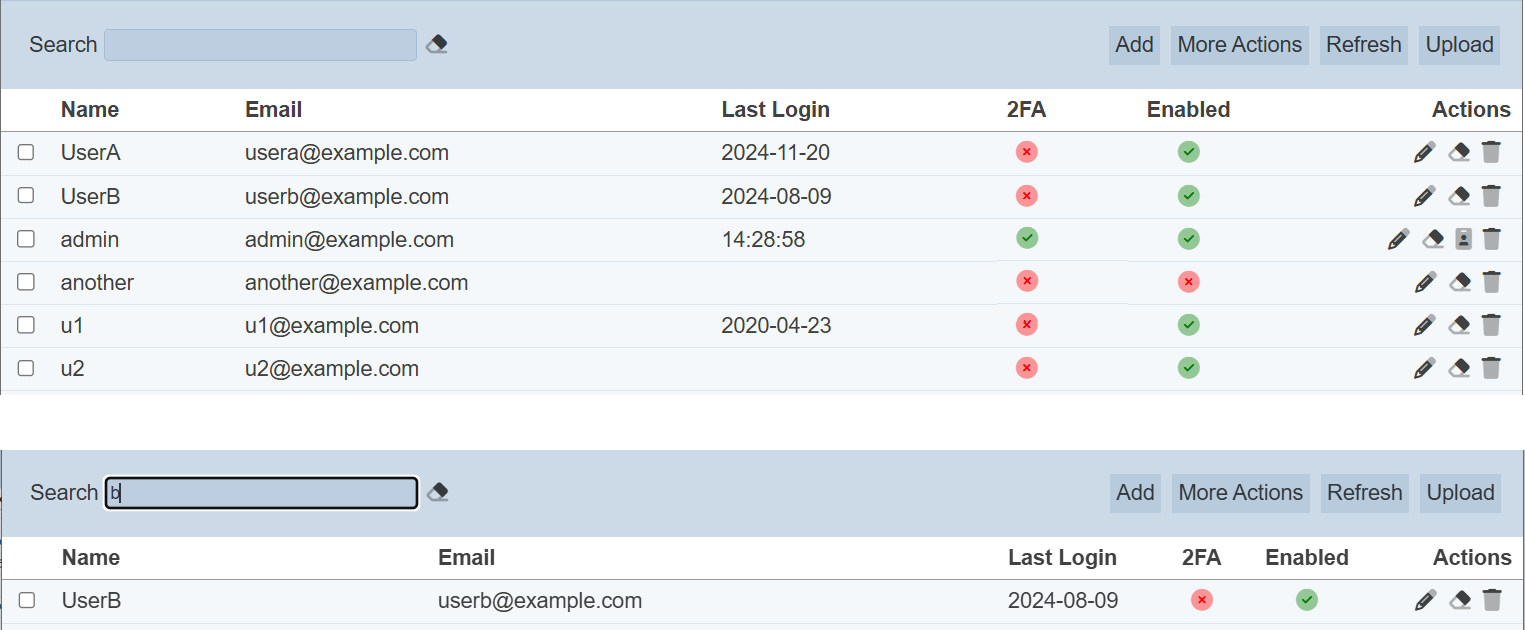After performing actions on the browser/tab, the list is reloaded to display the list of users. The manual “Refresh” button is available and is particularly useful if there are others making changes on the same page.
