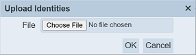 Instead of adding users one at a time, you can upload a list of users using a file. To do so, click on the “Upload” button on the upper right corner of the page. The Upload Identities dialog box appears to prompt you to browse for a JSON file. After selecting the file, click on the “OK” button to upload the file. Click on the “Cancel” button to abort the action.
