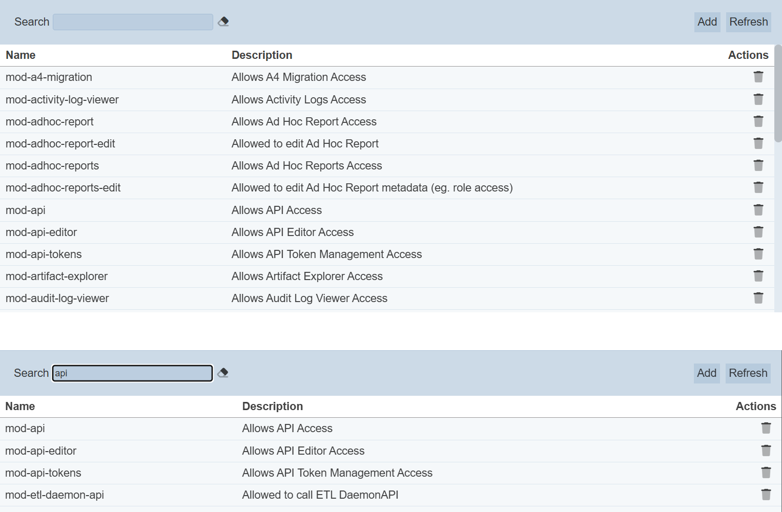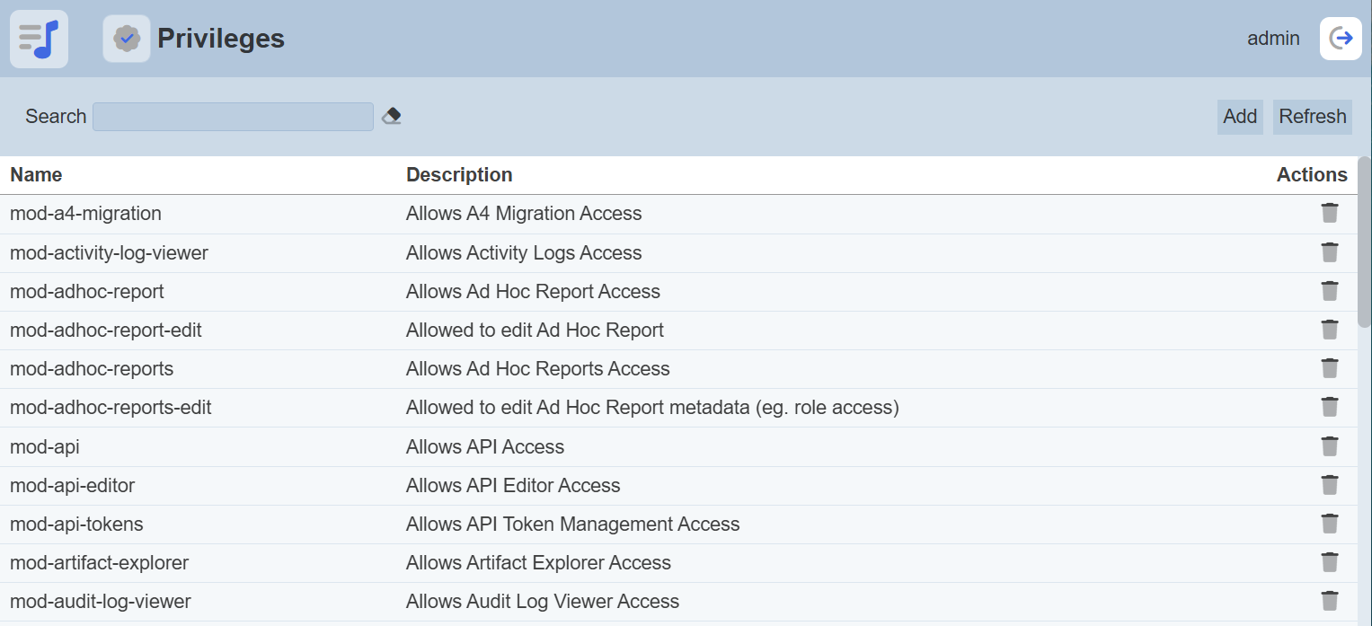 After performing actions (e.g. add privilege, delete privilege) on the browser window/tab, the list is reloaded to display the updated data. The manual “Refresh” button is available and is particularly useful if there are others making changes on the same page.