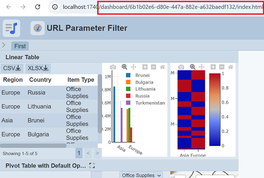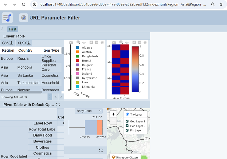 In the JSON Record ETL step, the “to” field defines the URL to the dashboard and “code” field defines the HTTP response status code. You can add parameters after the URL, for example to add filter to display only two regions, Asia and Europe: