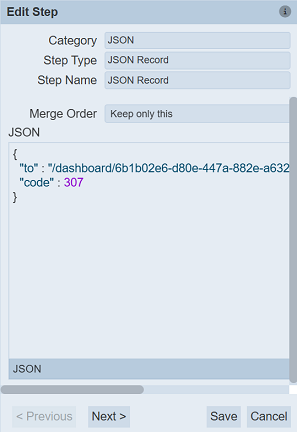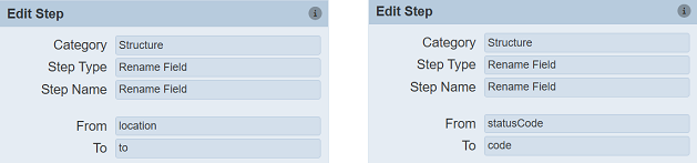 The second and third ETL steps rename the fields to the desired name, which are required in the redirect. In this case, location is renamed as to and statusCode is renamed as code.