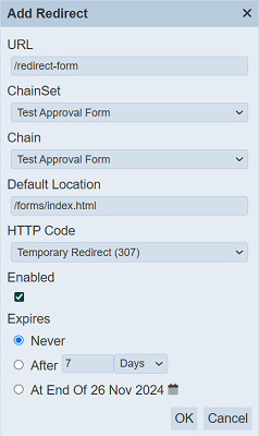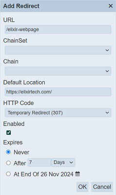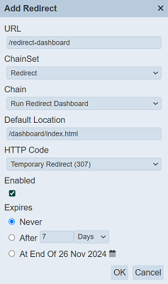 To create such a fixed redirect, the “Default Location” field in the “Properties” section of the redirect must be filled in. In the example below, a redirect is created to a fixed location. leaving the “Chainset” and “Chain” fields empty.