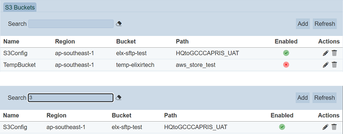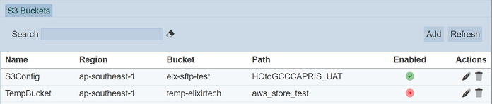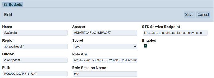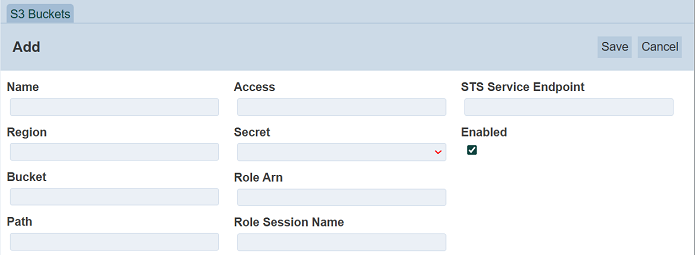| Enabled | If selected, enables the S3 bucket. An enabled S3 bucket is represented with a green tick under the “Enabled” column, while a disabled bucket is represented with a red cross. |