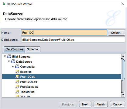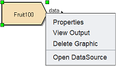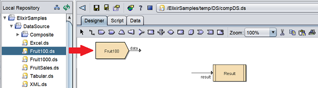From the repository on the left of the application, drag-and-drop the desired datasource onto the designer diagram. The DataSource processor will be labelled as the selected datasource. In the example below, Fruit100.ds is selected in the repository and is drag-and-drop onto the designer diagram. The DataSource processor bears the name Fruit100.