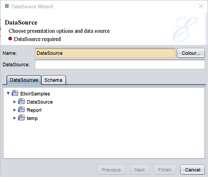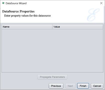 If no datasource is selected, the “DataSource” parameter will be blank and an error message will appear at the top of the wizard.