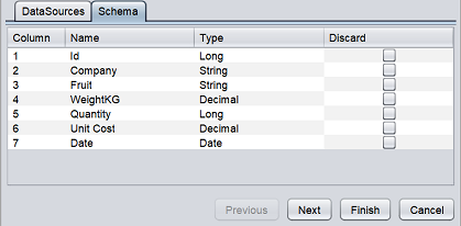 You can choose to discard any fields in the schema by selecting the checkbox under the “Discard” column. Discarding fields reduces he amount of memory needed to process the data.