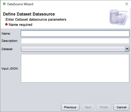 A Dataset datasource is a datasource is generated using the datasets accessed directly from the server. The different types of datasets, such as the usual MongoDB datasets, cached datasets, ETL datasets in the server can be used to generate the datasource.