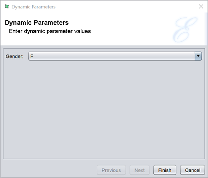 Once added into the field, click on the “Finish” button to save the change. To test the effect, click on the “Load Data” icon on the toolbar. The “Dynamic Parameters” dialog box will appear.