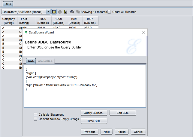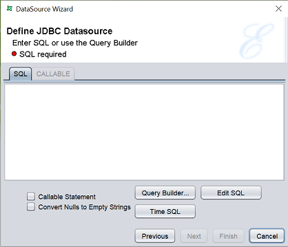 There are two ways to define the JDBC datasource. That is, either enter the desired DQL in the textbox or click on the “Query Builder…” button.