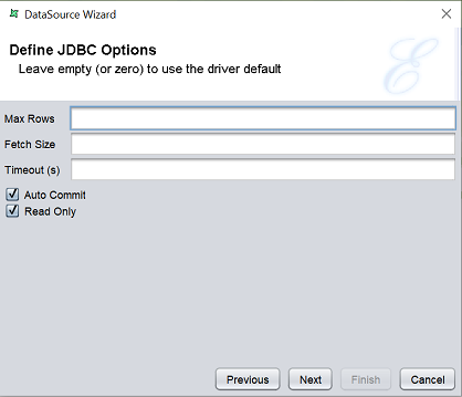 If the first three fields are left empty or “0” are used, the default values from the driver are used. The “auto Commit” and “Read Only” fields are selected by default.