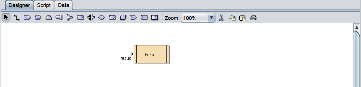 The result of an operation performed in the data designer can be viewed using this graphic. This can be doe by connecting the data output of any processor to the input of the “Result” box. When other tools, such as the Report Designer connect to the data designer, they will use the data provided by “Result”.