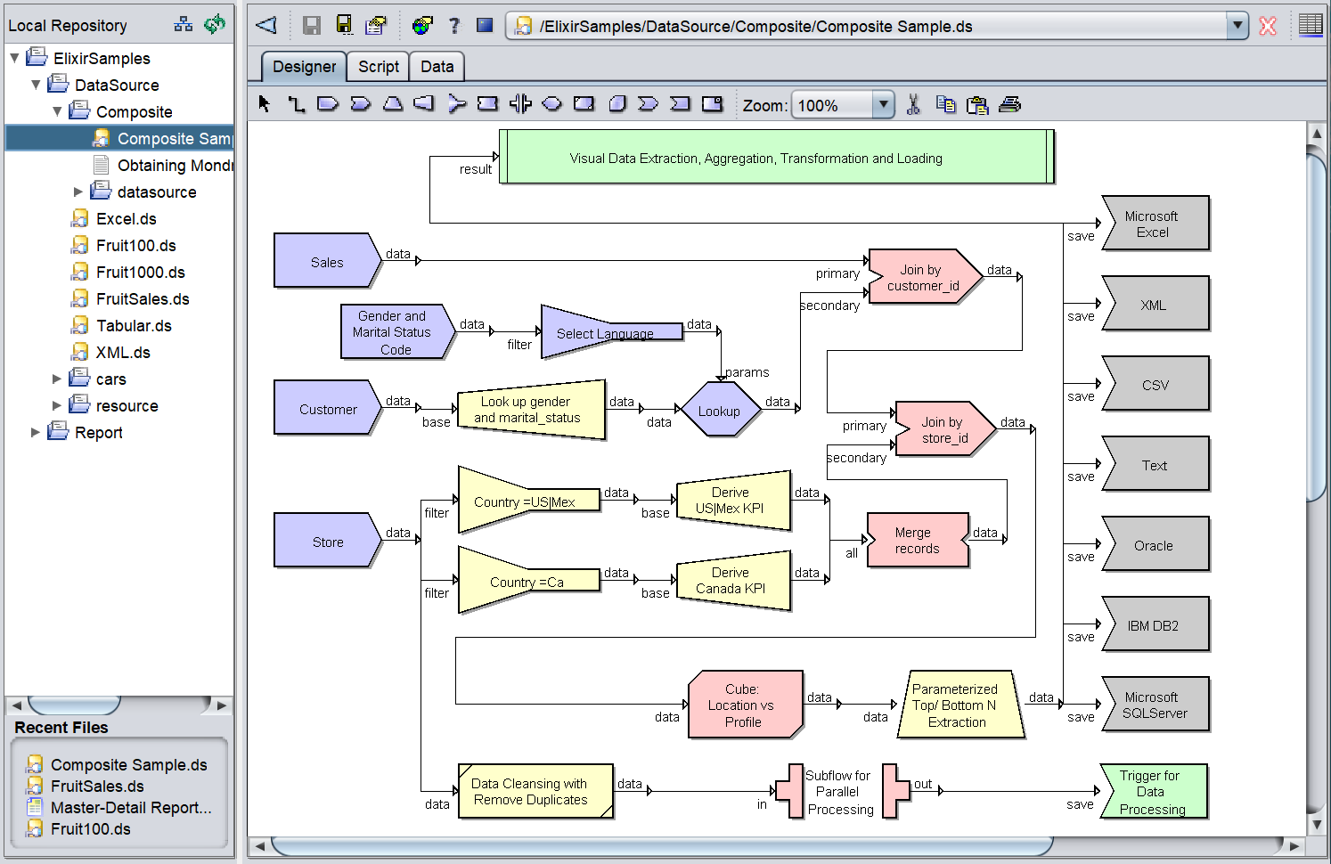 Through direct manipulation and inspection of data sources and flows, a coherent view of the overall data architecture can be gained. Time spent developing custom codes and programs can be avoided by using the tool to formulate the data processors nad intercept the flow at any stage to ensure correctness. Finally, the output can be generated into a variety of different data formats, including Microsoft Excel, relational database tables and Elixir Report Designer.