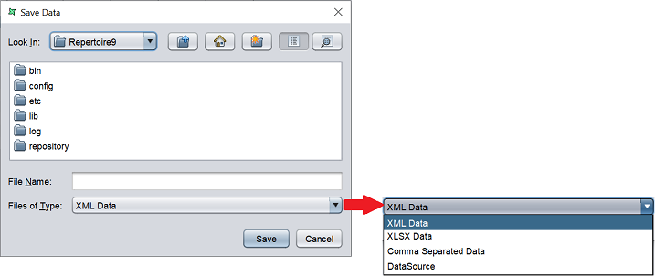 “Save Data” icon is clicked, the datasource displayed in the Data tab can be saved as a file in the selected format via a dialog box.