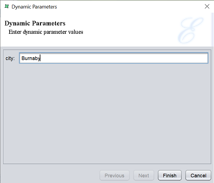 Key in the desired city in the “city” field. Click on the “Finish” button to render the report. The output report will be rendered and displayed in Microsoft Word.