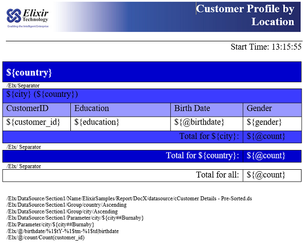 | Footer | Contains totals or similar information that appears at the end of each group. This can be defined by adding the following: /Elx/Footer |