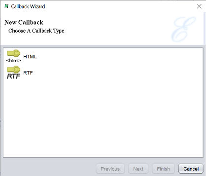To add a callback onto the report, select the “Callback” button and click onto the location in the report where the callback is to be placed. A “Callback Wizard” will appear.