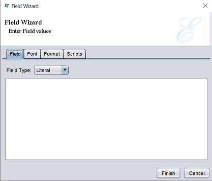 No formatting is required as it display whatever text is entered. On selecting field types other than “Literal”, the Label element changes to a Data Field element. Click on the “Finish” button to complete the process.