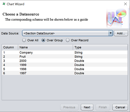 To edit the multichart in the report template, double-click on the MultiChart element. The “Composite Chart Wizard” will appear, which is identical to the wizard when adding a MultiChart element. Except that first page (which allows you to choose the composite type) is disabled.