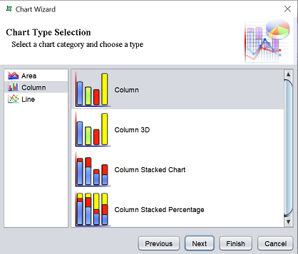 | Combination Chart | Selects the combination of difference charts. Available options: - Combination Category Plots - Allows the display of of two or more Area, Column and Line Charts together side by side - Combination XY Plots - Allows the combination of multiple XY plots |