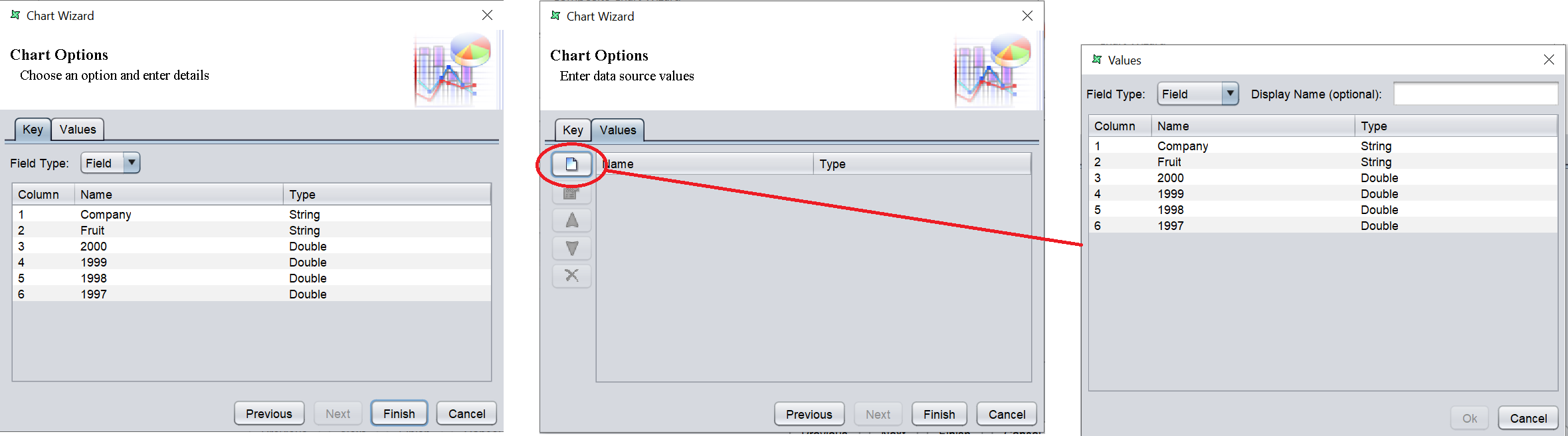 The “Key” tab allows you to define the key for the chart, which defines the X-axis. The “Values” tab allows you to define the values to be used in the chart, which defines the Y-axis.