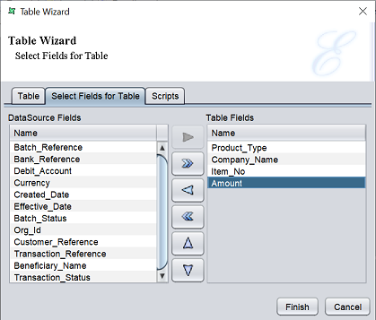 This page is divided into three parts. On the left is the “DataSource Fields” panel where all fields from the datasource are displayed. On the right is the “Table Fields” panel where the fields to be used for the table is listed. By default it is empty. At the centre is a column of buttons, which allows you to move the fields to and fro the two panels and arrange the order of the fields in the “Table Fields” panel. By default, only the “Move All Right” button is enabled at the centre (without selecting any field).