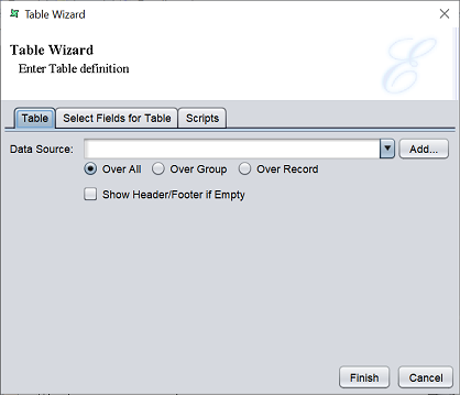 In the “Select Fields for Table” tab, once a datasource is selected in the “Table” tab, the fields in the datasource will appear in this tab. If no datasource is selected, this tab will be empty.